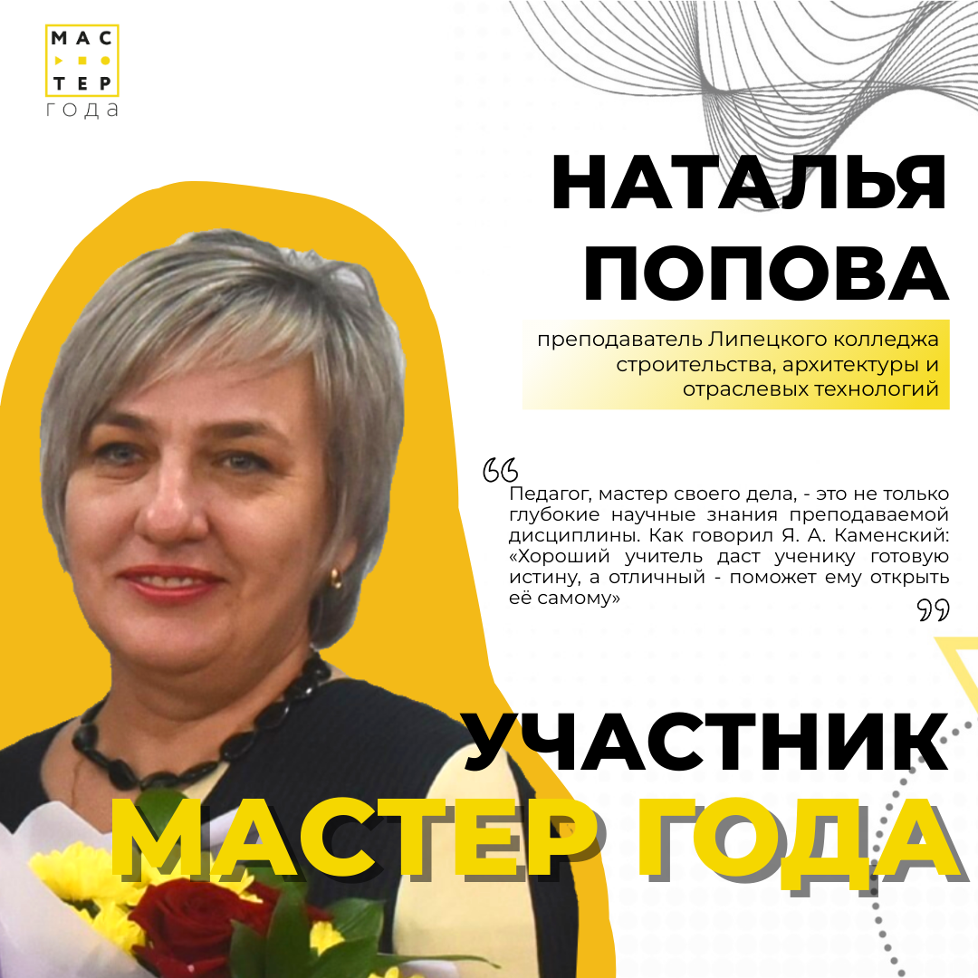 «В конкурсе профессионального мастерства «Мастер года» принимаю участие впервые. Мои главные цели – это повышение престижа образовательного учреждения и педагогических профессий, ну и конечно же, любой профессиональный конкурс - это колоссальная школа по обмену опытом с коллегами, возможность обменяться идеями и инновационными технологиями в области методики преподавания и педагогике».