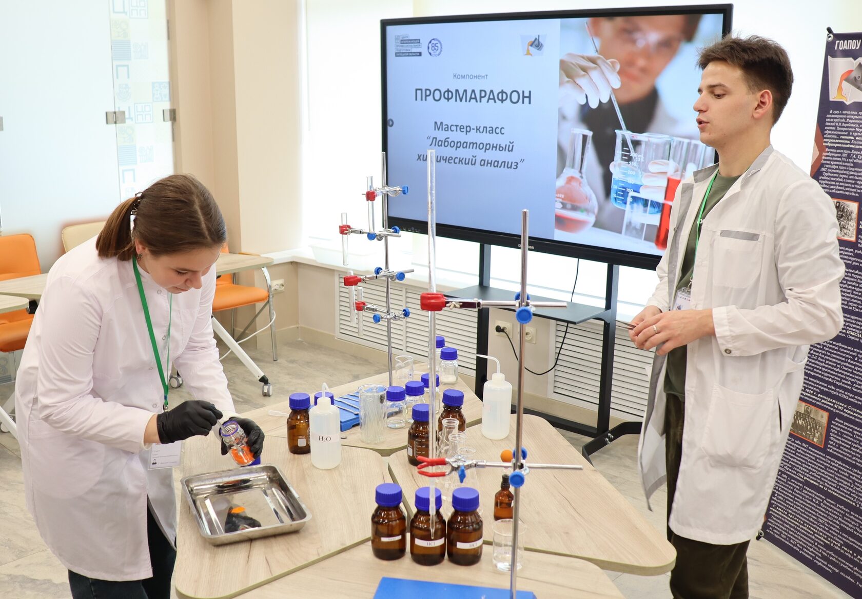 Под руководством преподавателя Козырева Данилы Игоревича студенты колледжа демонстрируют алгоритм химического лабораторного анализа: измерения, смешение, наблюдение за реакциями